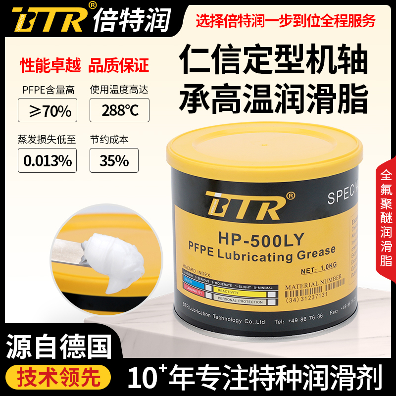 倍特润BTR HP-500LY仁信定型机轴承高温润滑脂不会燃烧,高温无分解,无积碳,而且化学惰性强、不与强酸、强碱等反应,因而此产品具有耐高温、抗磨、耐腐蚀、使用寿命长等特点,推荐应用于有高温、接触化学介质、要求长寿命的工况。适用温度范围:-50℃~+288℃,最高间歇耐温300℃。