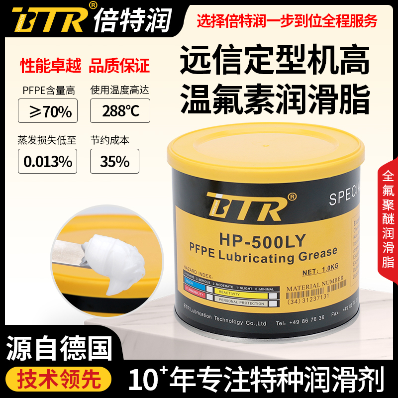 倍特润BTR HP-500LY远信定型机高温氟素润滑脂不会燃烧,高温无分解,无积碳,而且化学惰性强、不与强酸、强碱等反应,因而此产品具有耐高温、抗磨、耐腐蚀、使用寿命长等特点,推荐应用于有高温、接触化学介质、要求长寿命的工况。适用温度范围:-50℃~+288℃,最高间歇耐温300℃。